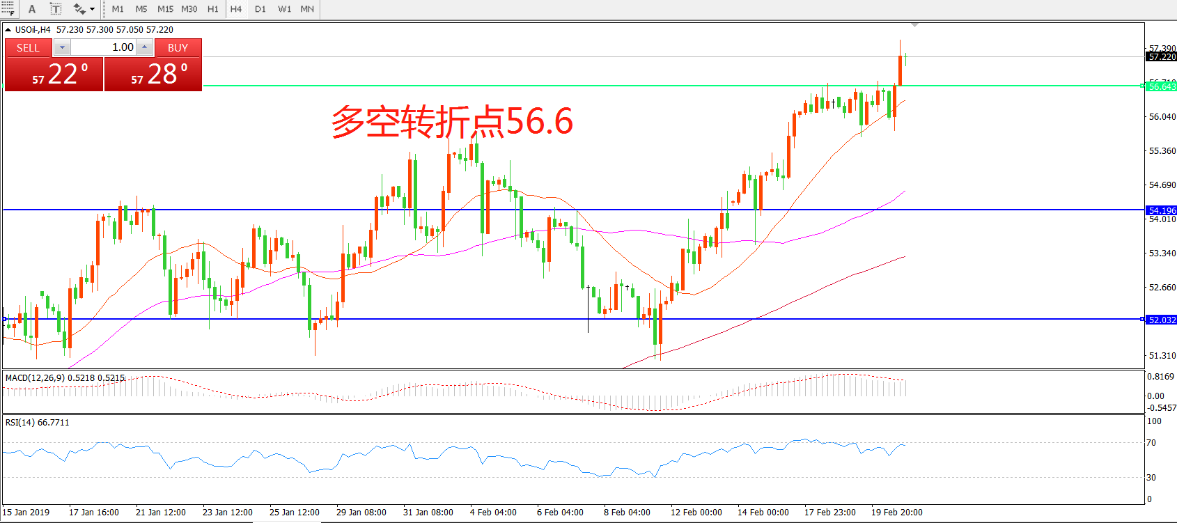 交易策略:在56.60  之上看涨,目标58.00    62.00