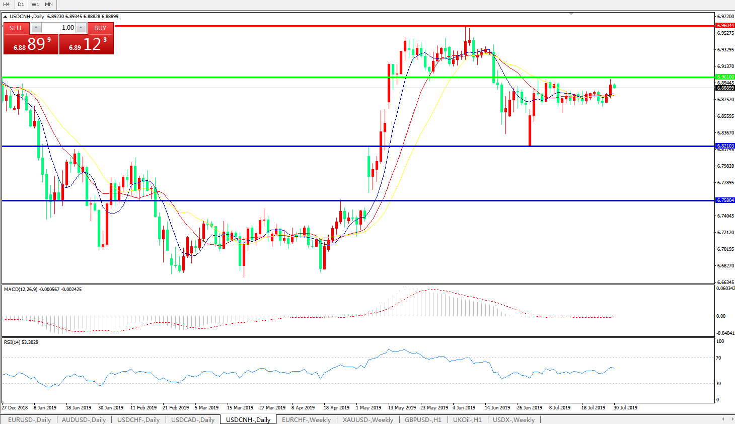 交易策略: 在6.9010之下,看跌,目标价位为6.8210,然后为6.7580。