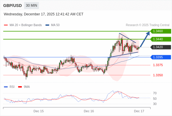 在 1.3395 之上,看涨,目标价位为 1.3440 ,然后为 1.3460 。
