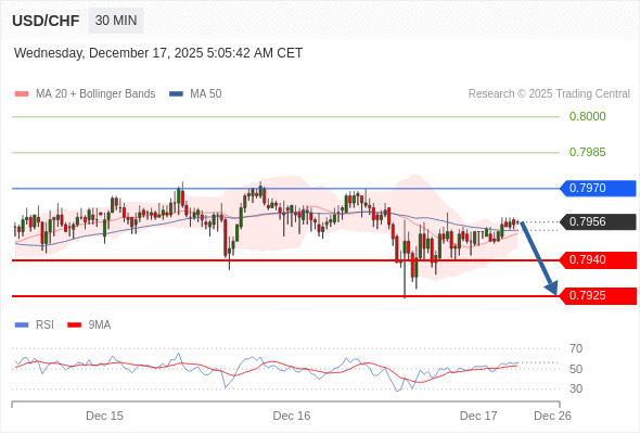 在 0.7970 之下,看跌,目标价位为 0.7940 ,然后为 0.7925 。