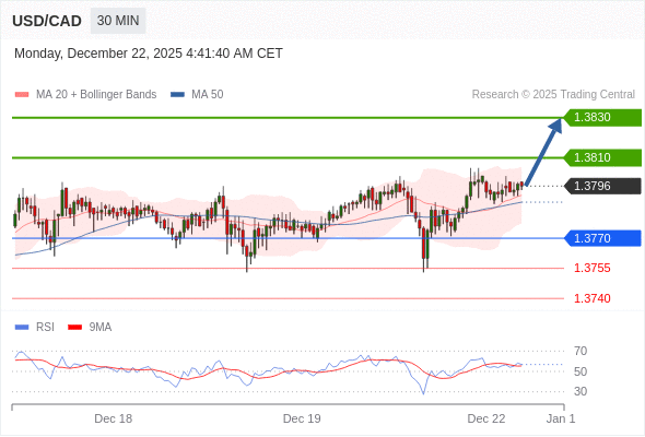 在 1.3770 之上,看涨,目标价位为 1.3810 ,然后为 1.3830 。