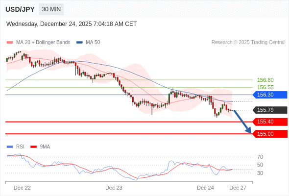 在 156.30 之下,看跌,目标价位为 155.40 ,然后为 155.00 。