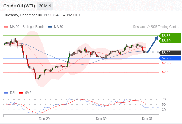 在 57.75 之上,看涨,目标价位为 58.60 ,然后为 58.90 。