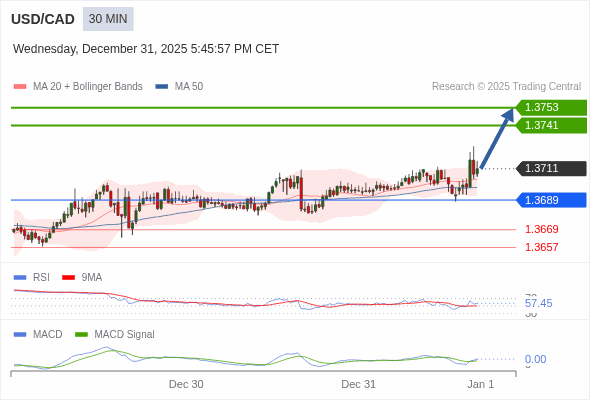 美元/加元 当日内 : 看涨,当 1.3689 为支撑位。