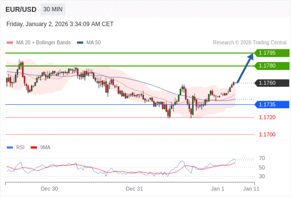 在 1.1735 之上,看涨,目标价位为 1.1780 ,然后为 1.1795 。