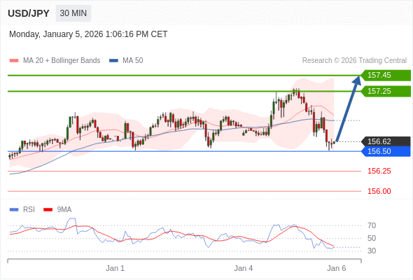 在 156.50 之上,看涨,目标价位为 157.25 ,然后为 157.45 。