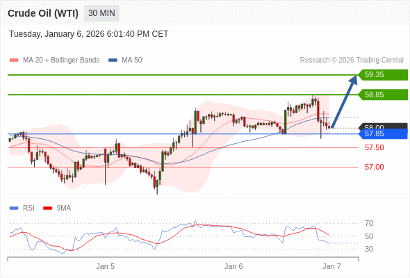 在 57.85 之上,看涨,目标价位为 58.85 ,然后为 59.35 。