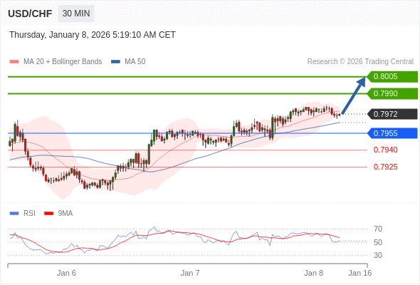 在 0.7955 之上,看涨,目标价位为 0.7990 ,然后为 0.8005 。