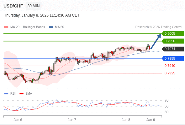 在 0.7955 之上,看涨,目标价位为 0.7990 ,然后为 0.8005 。