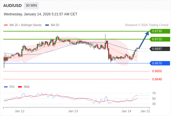 在 0.6670 之上,看涨,目标价位为 0.6715 ,然后为 0.6730 。