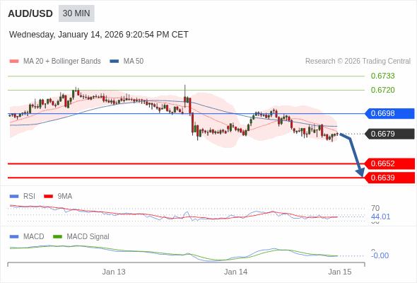 澳元/美元 当日内 : 看跌,在 0.6698 之下。