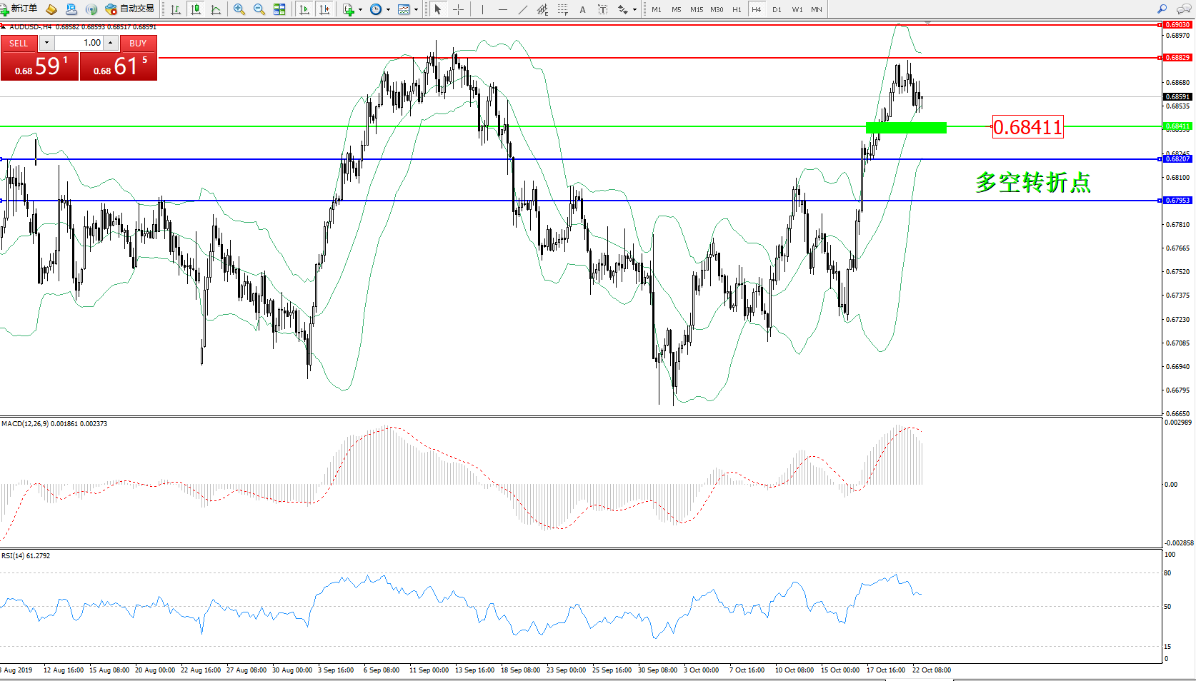 交易策略:0.68411上方看涨,目标0.68829、0.69030
