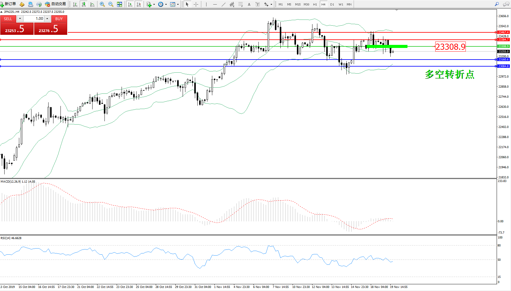 日经225指数11月19日(周二)收盘下跌125.26点,跌幅0.53%,报23291.50点。日本央行行长黑田东彦:一旦达到物价目标,日本央行将使政策正常化,地区银行若要提高业务前景的可能选项为与其他产业企业合并、结盟与联盟,当央行在促进货币宽松以达成物价目标时,财政政策的刺激效果将会提高,政策混合指的是一般意义上的政策组合 ,财政政策和货币政策结合更能产生刺激作用,目前有限的数据显示消费税上调影响较小,不认为政策选项是无限的,日本央行有多种措施来放松政策,可以将它们结合起来,或者部署它们的增强版本,未来日本央行还有进一步降息的空间,日本央行还没有达到债券购买的限额,市场上还有日本央行可以买进的日债,在考虑进一步宽松政策时必须权衡利弊,只有少数委员认为日本央行无法将利率降至-0.1%以下,从未说过日本央行可以无限制地降息,有可能降低利率,日本央行有采取更多政策措施的空间,将继续竭尽全力实现价格目标。
