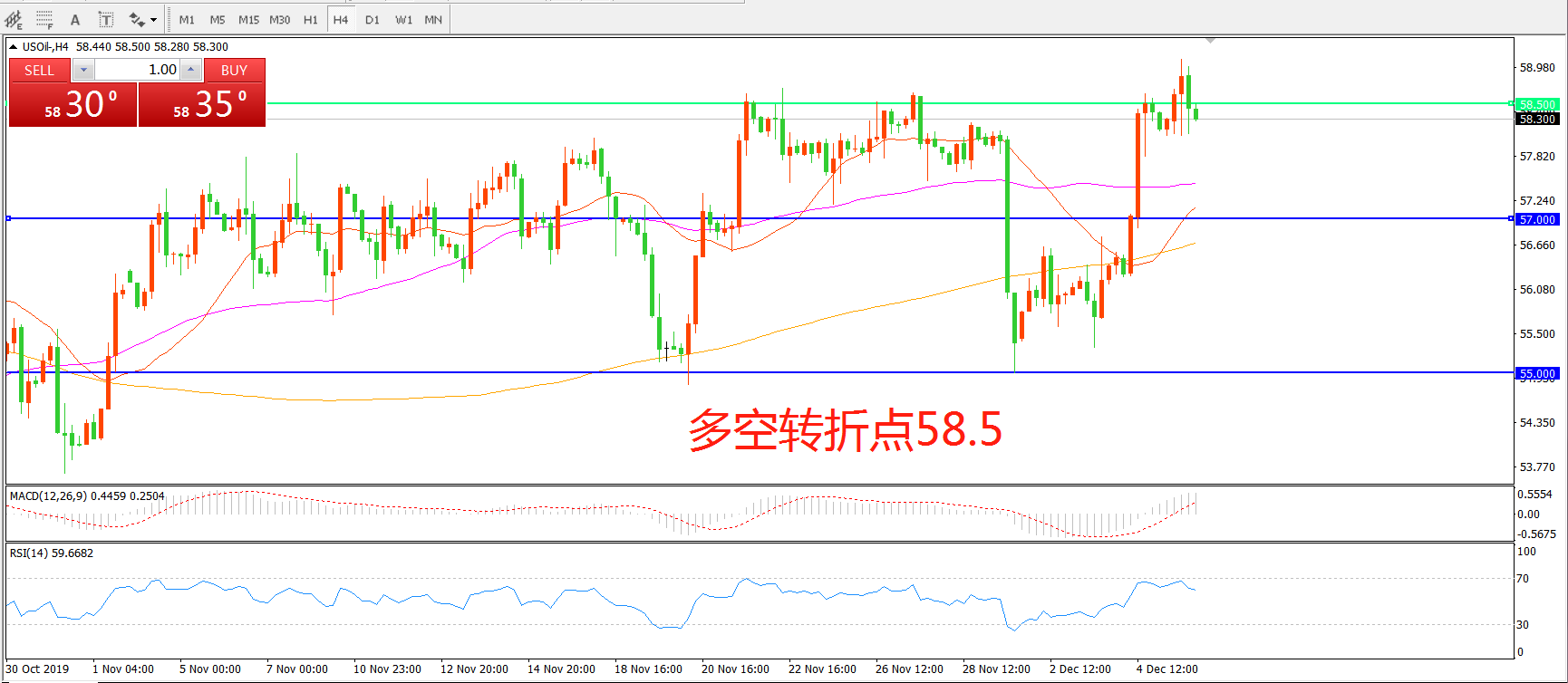 周四(12月5日) ,OPEC成员国在维也纳召开会议,目前市场预计各成员国将同意进一步减产,以支撑油价,有消息称沙特和俄罗斯都已经建议扩大减产,在现有120万桶/日的基础上额外减产50万桶/日,目前各方仍在等待减产会议的最终结果 美国WTI原油冲高回落,收报58.30美元/桶。OPEC+将在周五的会议上就更新的减产协议进行投票,市场各方目前都在等待会后声明的公布。