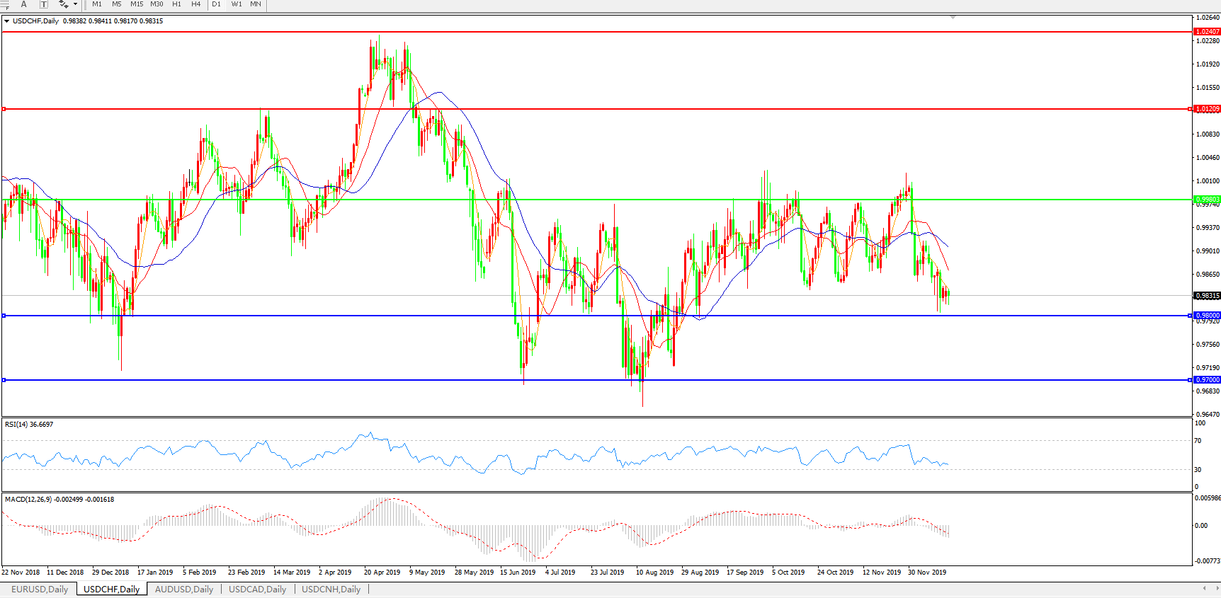 技术面简析:日线图均线呈有序空头排列,汇价弱势震荡持稳于0.98关口附近,MACD运行于0轴下方且量能0轴下持续放量,RSI震荡走低,预计汇价存进一步下行空间。
