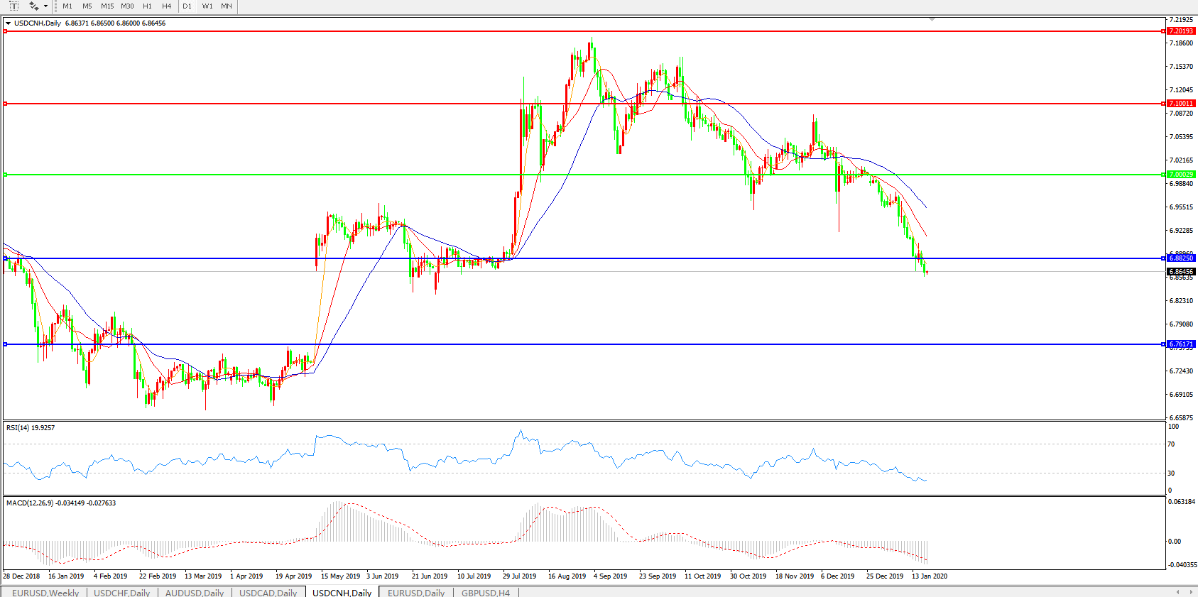 交易策略: 在7.0000之下,看跌,目标价位为6.8820,然后为6.7600。