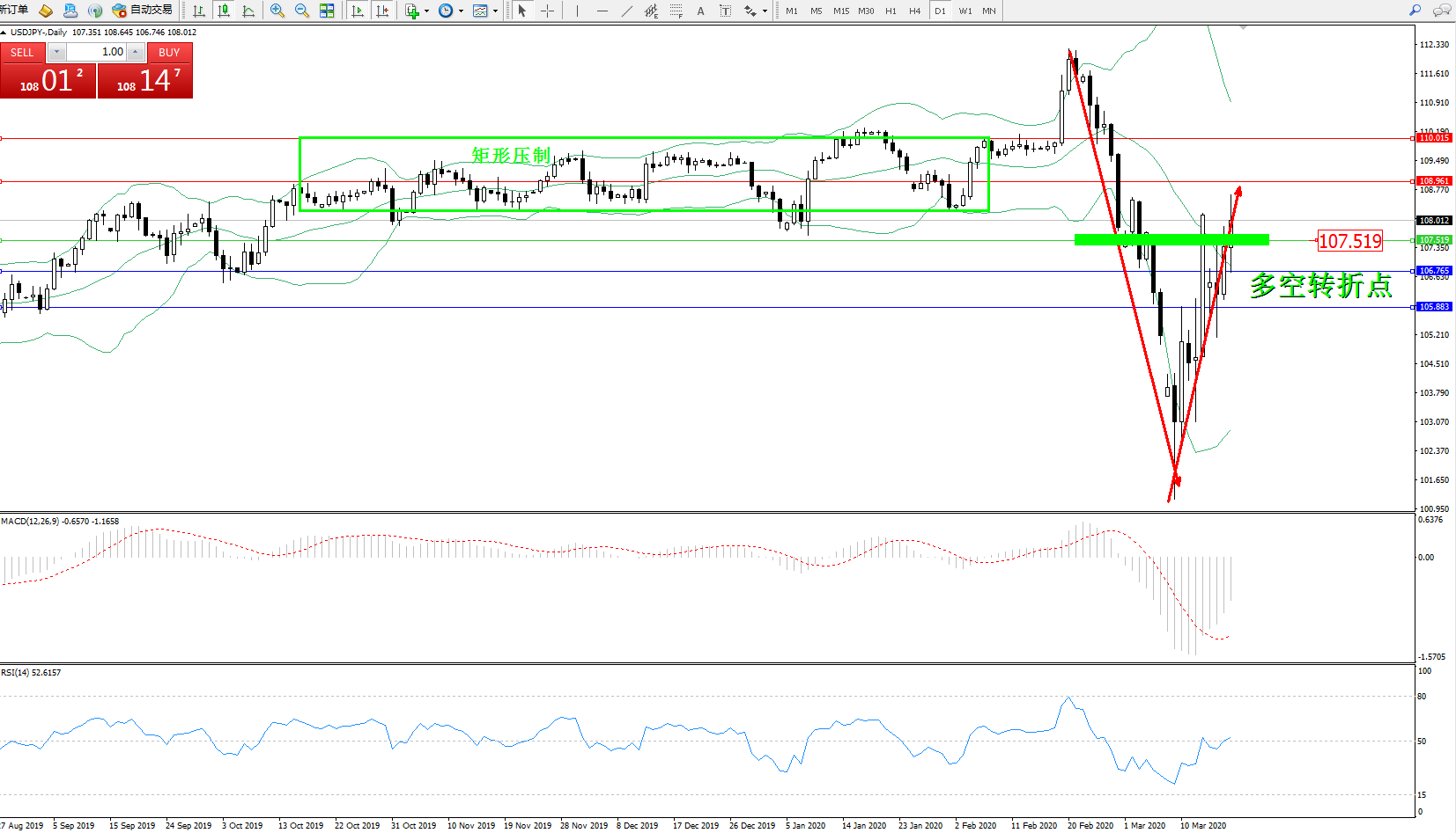 交易策略:107.519上方看涨,目标108.961110.015