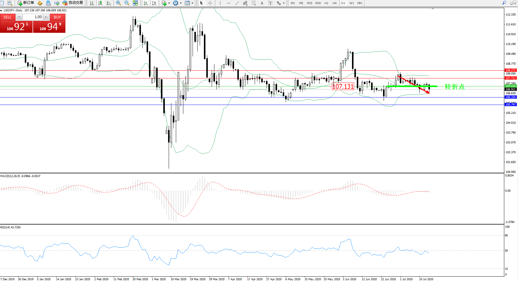 交易策略:107.131下方看跌,目标106.335105.797