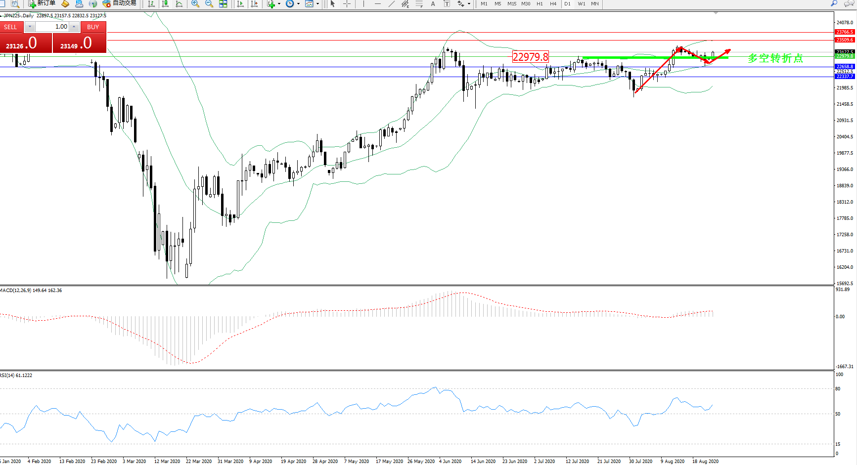 日经225指数8月24日(周一)收盘上涨64.20点,涨幅0.28%,报22984.50点。亚洲股市走高,近期全球股市继续高涨,但全球各地疫情均有不同程度的反弹,日本电视台援引多位政府和执政党消息人士的话说,日本首相安倍正在接受慢性疾病治疗,而不是体检。但日本首相安倍晋三表示,前往医院是去听上周检查的详细结果,考虑召开新闻发布会解释他本人的健康状况,将会在好好照顾自己的身体同时,继续努力工作。日本资金外流减弱,美国财政僵局导致的美元看跌环境,以及美日实际收益率差距深化,此外抗风险的日元也被低估了,尽管美元最近贬值,但仍比长期平均水平高出6%。