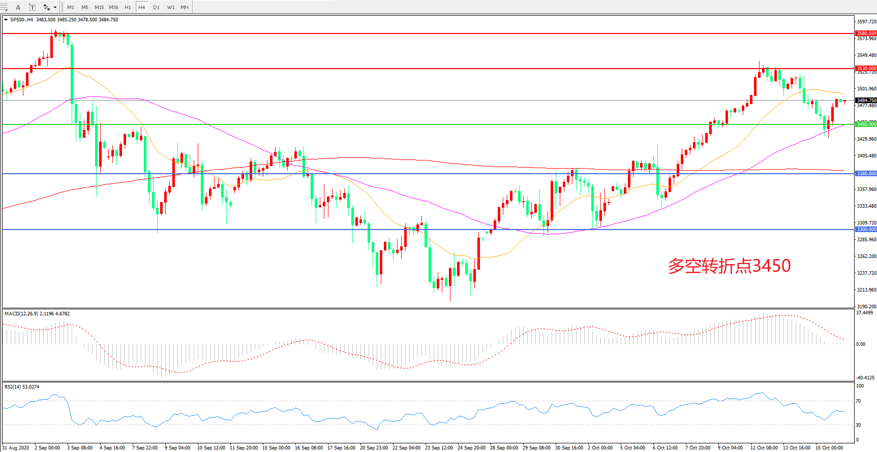 周四(10月15日),国际金融市场可谓是“翻云覆雨” ,欧洲二次疫情加剧,英法等国防疫举措不断升级,市场风险情绪迅速恶化,美股开盘后,三大指数跌幅跌超1%,随后特朗普就经济刺激计划表态,同意将刺激计划的规模提升至1.8万亿美元以上,市场认为仍有机会在11月3日大选之前通过刺激方案,标普500震荡回升,收报3484.75点。