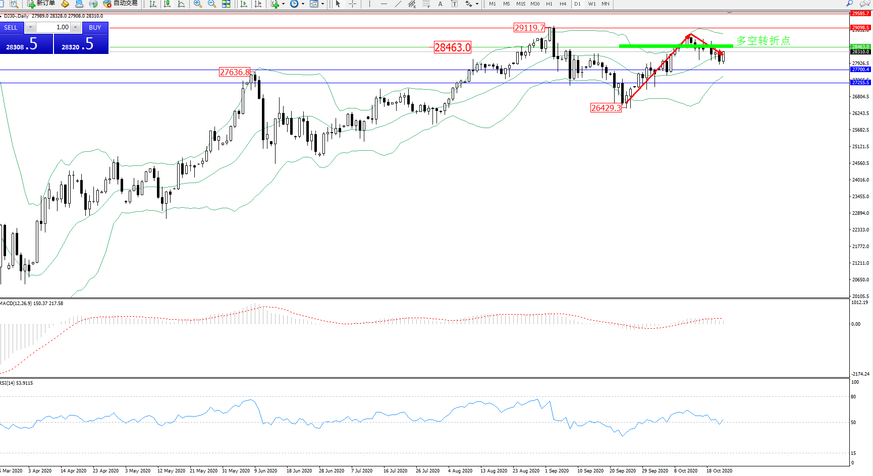 道琼斯指数10月22日(周四)收盘上涨152.80点,涨幅0.54%,报28363.66点。美国股市上涨,银行股走高,美国国会仍在就刺激法案进行磋商。金融股上涨近2%,能源股追随油价涨势,小型股上涨1.5%。华府的刺激方案谈判仍是投资者关注焦点,议员们还在磋商之中。虽然众议院议长佩洛西对与政府达成协议表示乐观,但共和党掌控的参议院仍然对大规模协议表示反对,这使得大选前达成协议的可能性降低。美元指数上涨0.32%至92.94;美国众议院议长佩洛西称有望就刺激方案一项关键内容达成协议,美元一度收窄涨幅。美国国债5s30s扩大,超过1.30个百分点,为2016年11月以来最高水平。美国首次申请失业救济人数四周来第三次下降,未改美元涨势。