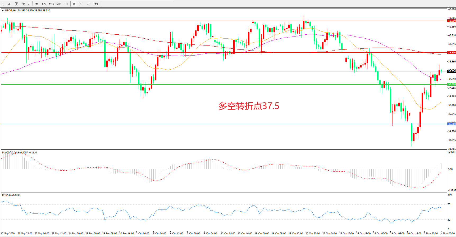 4小时图看,油价低位连续拉升,短期表现有所回暖,37.5美元成为下方支撑,均线系统走平,MACD红柱增加,RSI指标走平,日内延续上行概率较大。