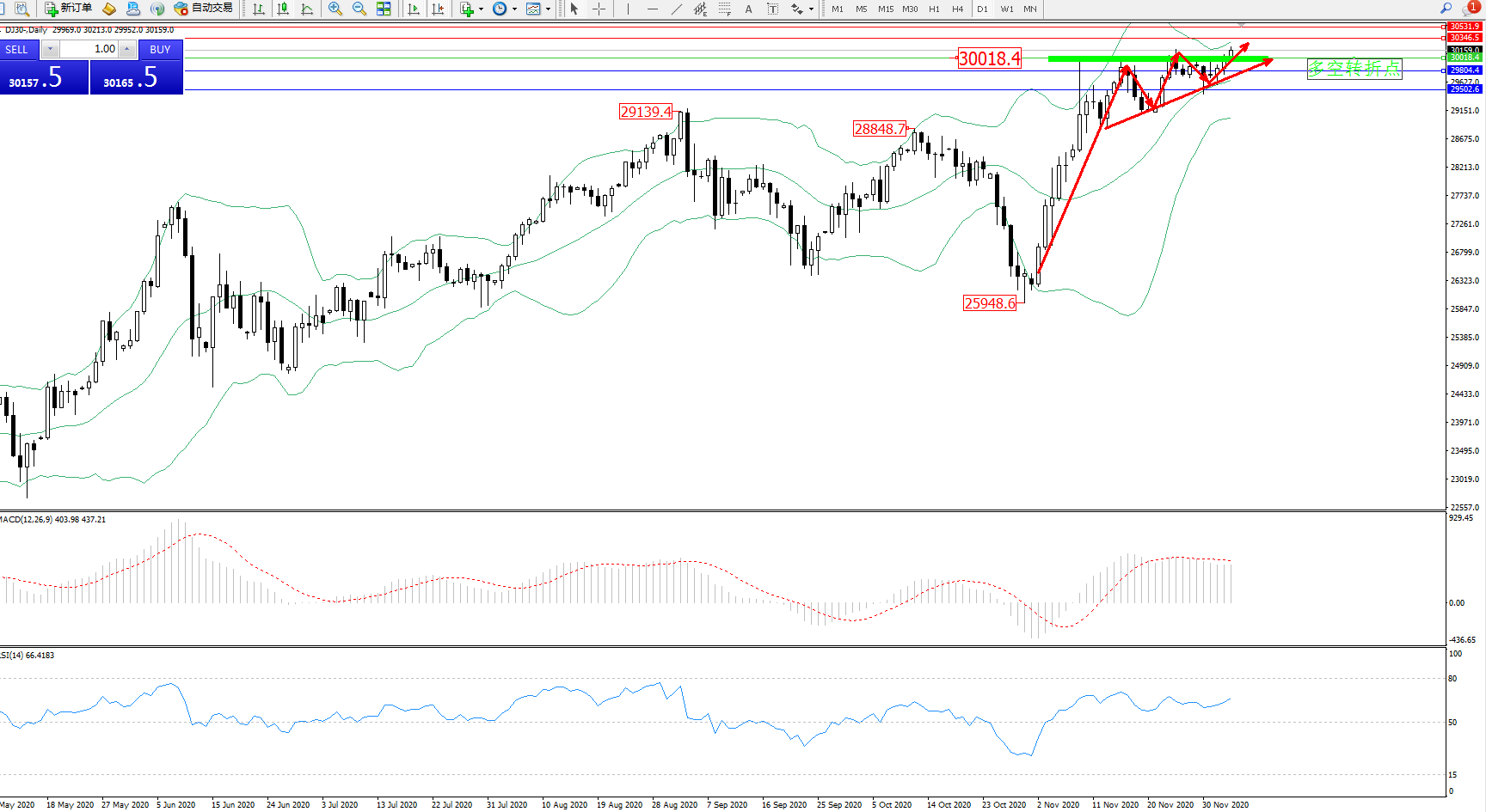 道琼斯指数12月4日(周五)收盘上涨248.70点,涨幅0.83%,报30218.26点。美股三大指数全部收涨,美国股市刷新历史记录,在数据显示美国11月就业增长放缓后,市场对于推出更多联邦刺激措施的预期升高。美国劳工部数据显示,11月新增非农就业低于预估的24.5万,失业率下降0.2个百分点至6.7%,当选总统拜登称该数据“黯淡”,并表示国会应该马上通过新的抗疫刺激法案。众议院议长佩洛西表示,尽管共和党人对跨党派小组刺激提案中涉及州援助的部分表示不满,但整体势头在向着就财政刺激计划达成妥协的方向发展。上个月美国就业增长放慢,强化了人们关于国会更有可能通过财政刺激措施的预期。;该指数本周累计下跌1.08%,其一个隐含波动率达到了11月3日以来的最高水平。美国国债下跌,10年期国债收益率攀升至0.9842%,为3月以来最高点。