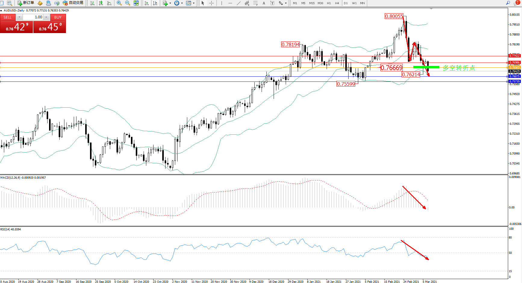 交易策略:0.76669下方看跌,目标0.76075、0.75739