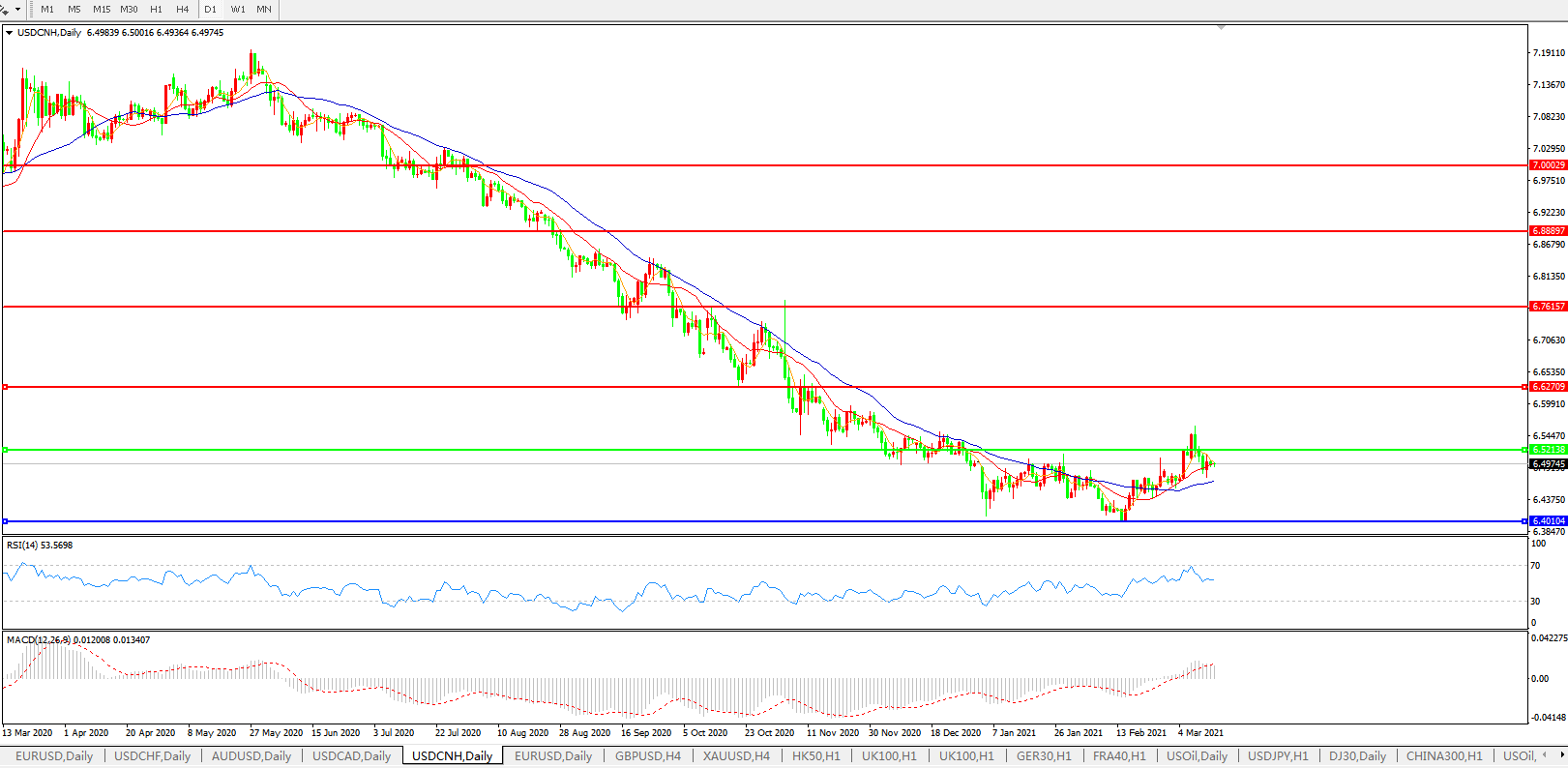 备选策略: 在6.5200之上,看涨,目标价位为6.6300,然后为6.7615。