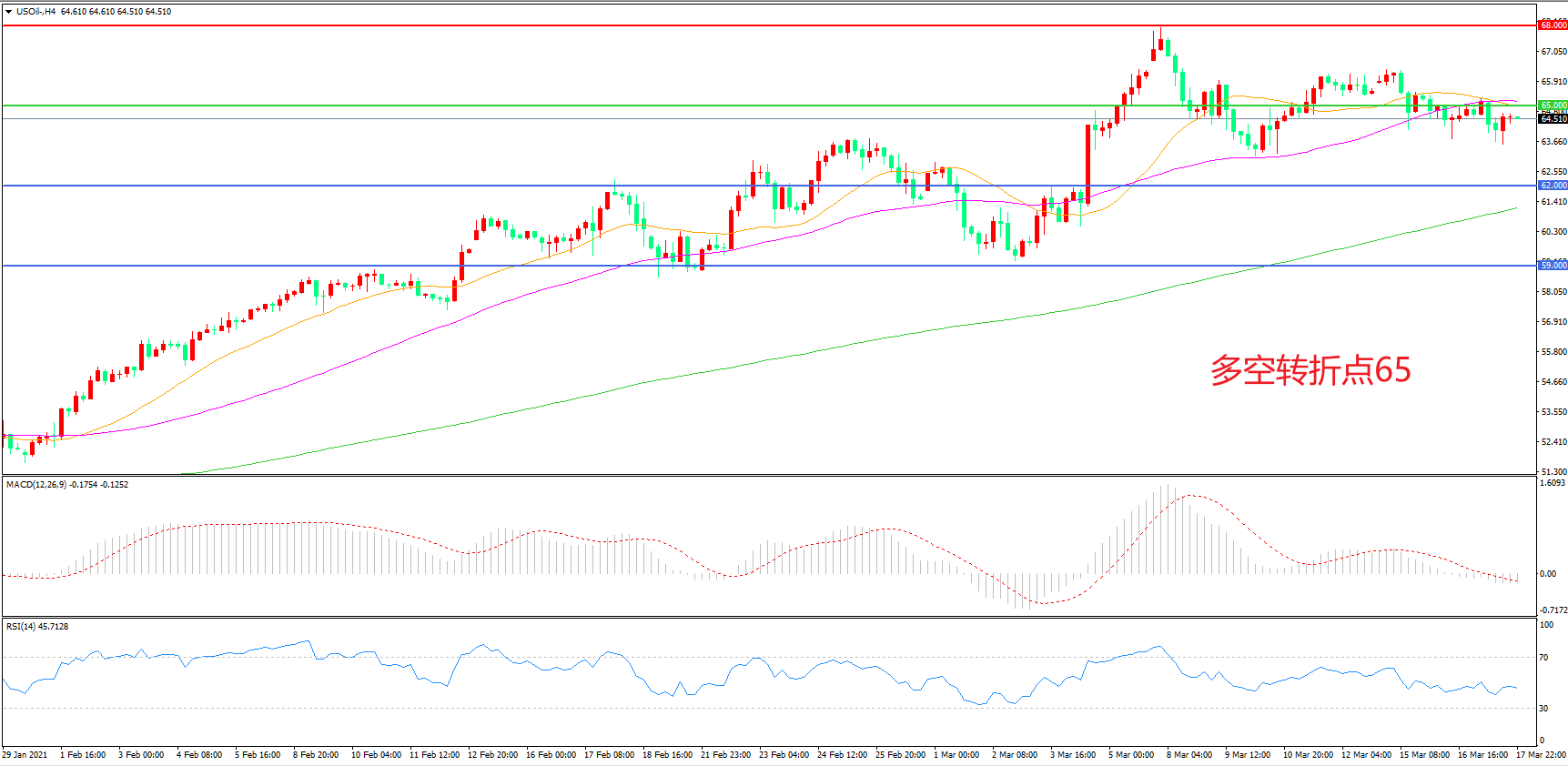 4小时图看,油价以55周期为轴心高位震荡,整体波幅不大,65美元成为短期多空分水岭,68美元成为上方阻力,MACD绿柱增加,RSI指标走平,日内延续震荡概率较大。