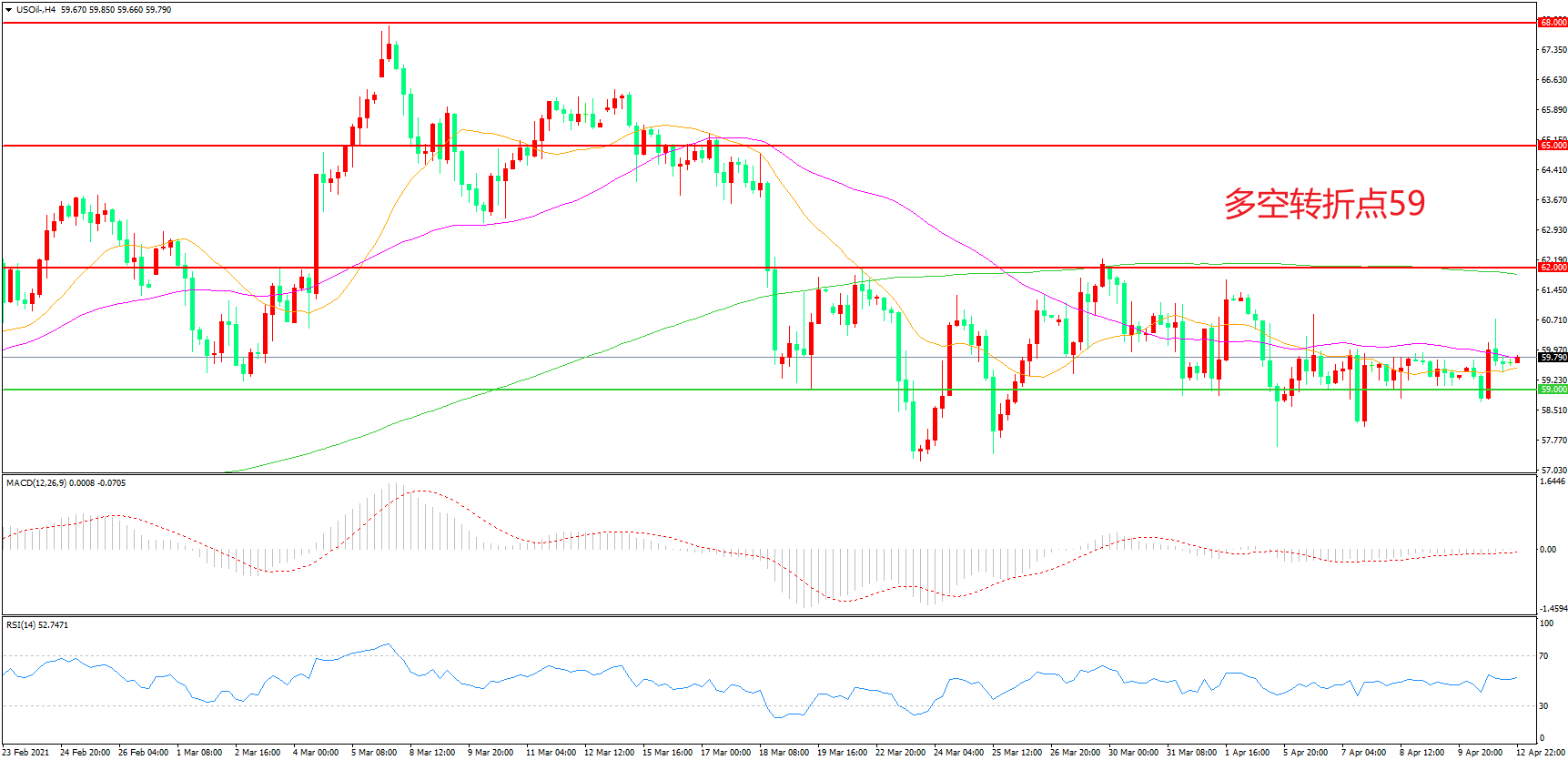 4小时图看,油价先涨后跌,区间震荡迹象明显, 59美元成为短期支撑,55均线成为上方阻力,MACD红柱增加,RSI指标走平,日内延续震荡概率较大。