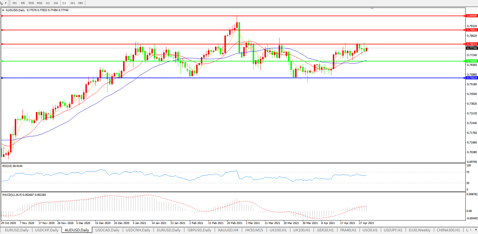备选策略:0.7680下方看跌,目标0.7560、0.7400