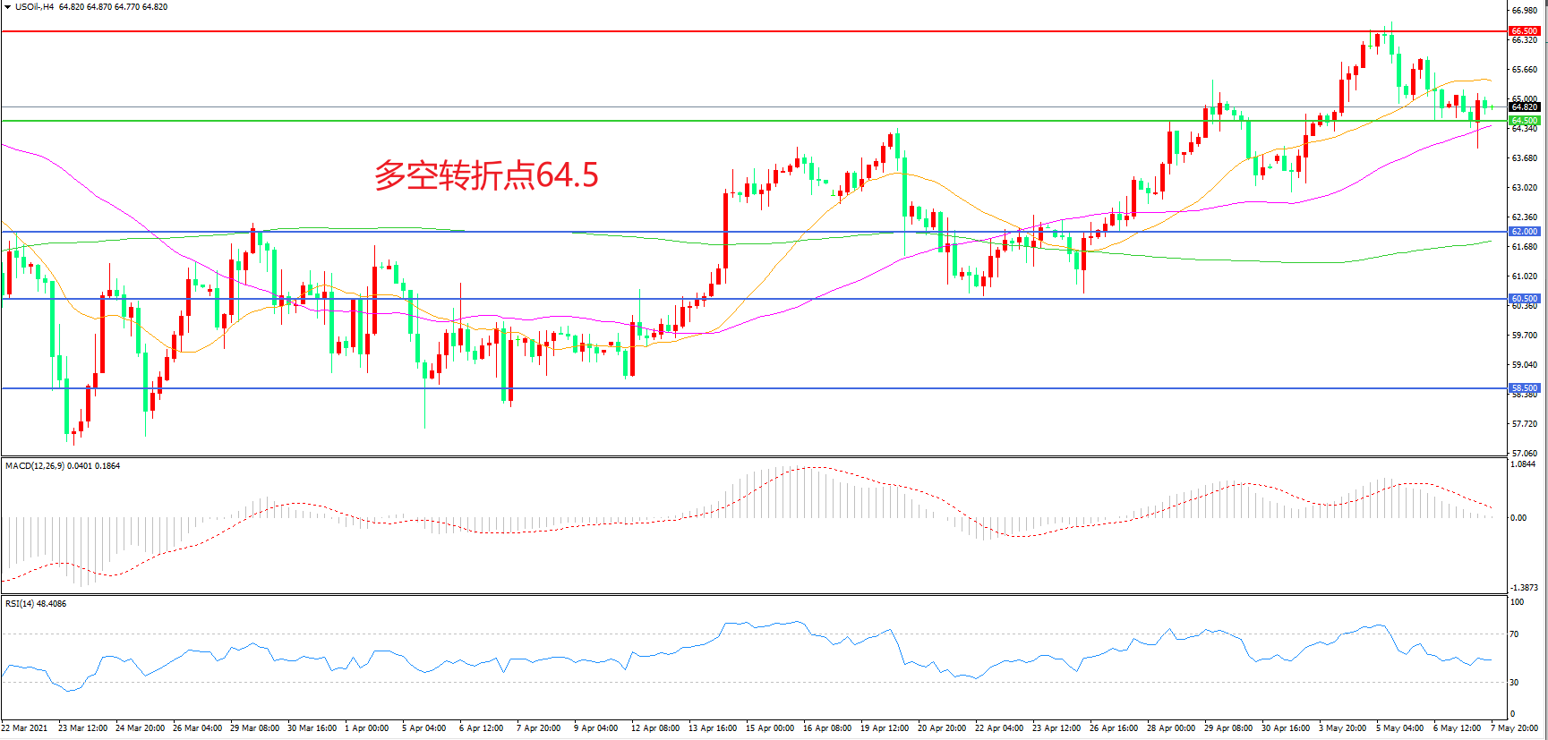 4小时图看,油价冲击66.5美元附近后快速回落,短期涨势受到遏制,形态上区间震荡迹象较为明显,均线系统走平,MACD红柱缩短,RSI指标走平,日内震荡延续概率较大。