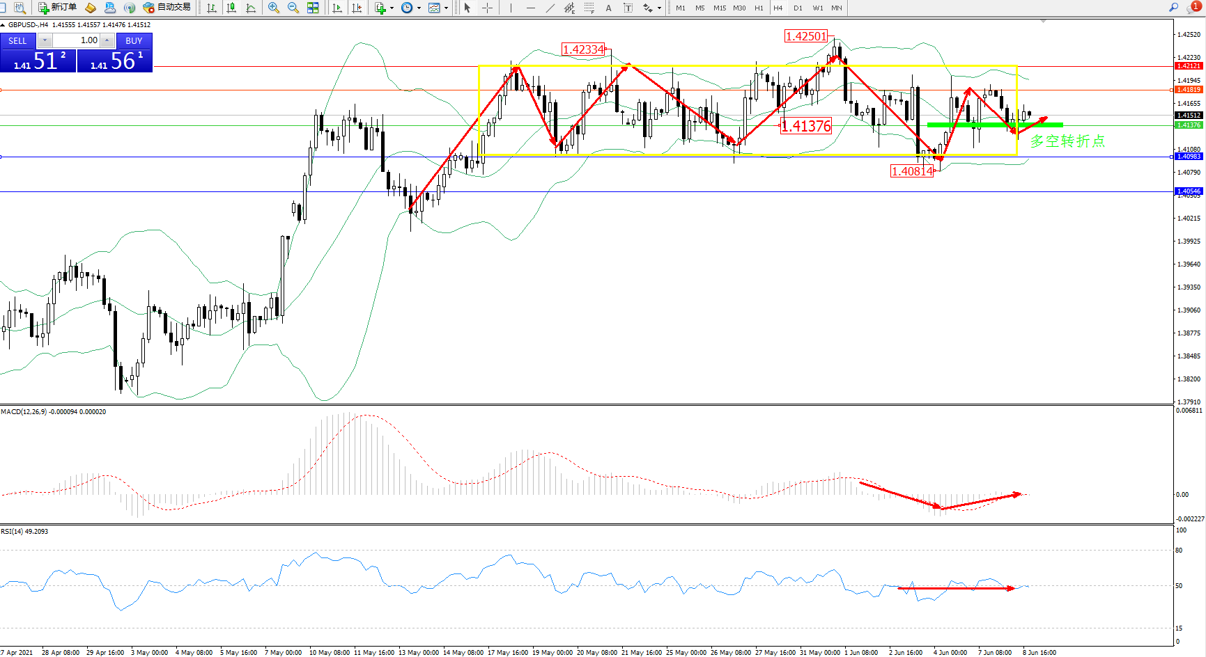 交易策略:1.41376上方看涨,目标1.41819、1.42121