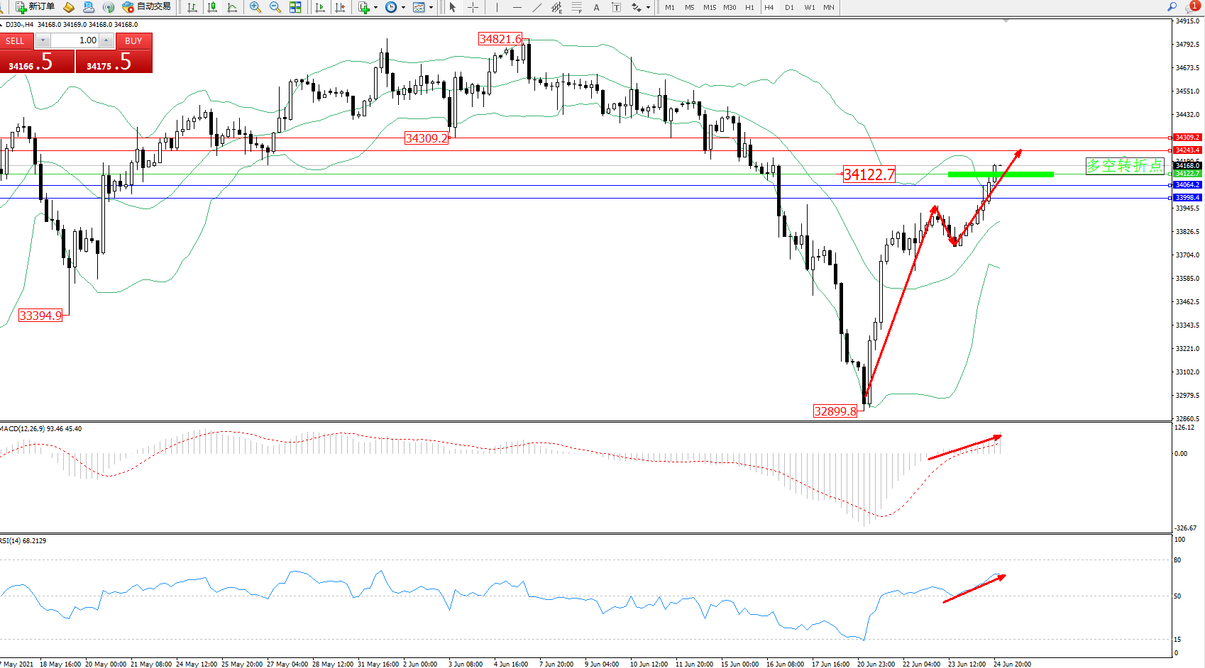 道琼斯指数DJ30——4小时K线图显示: