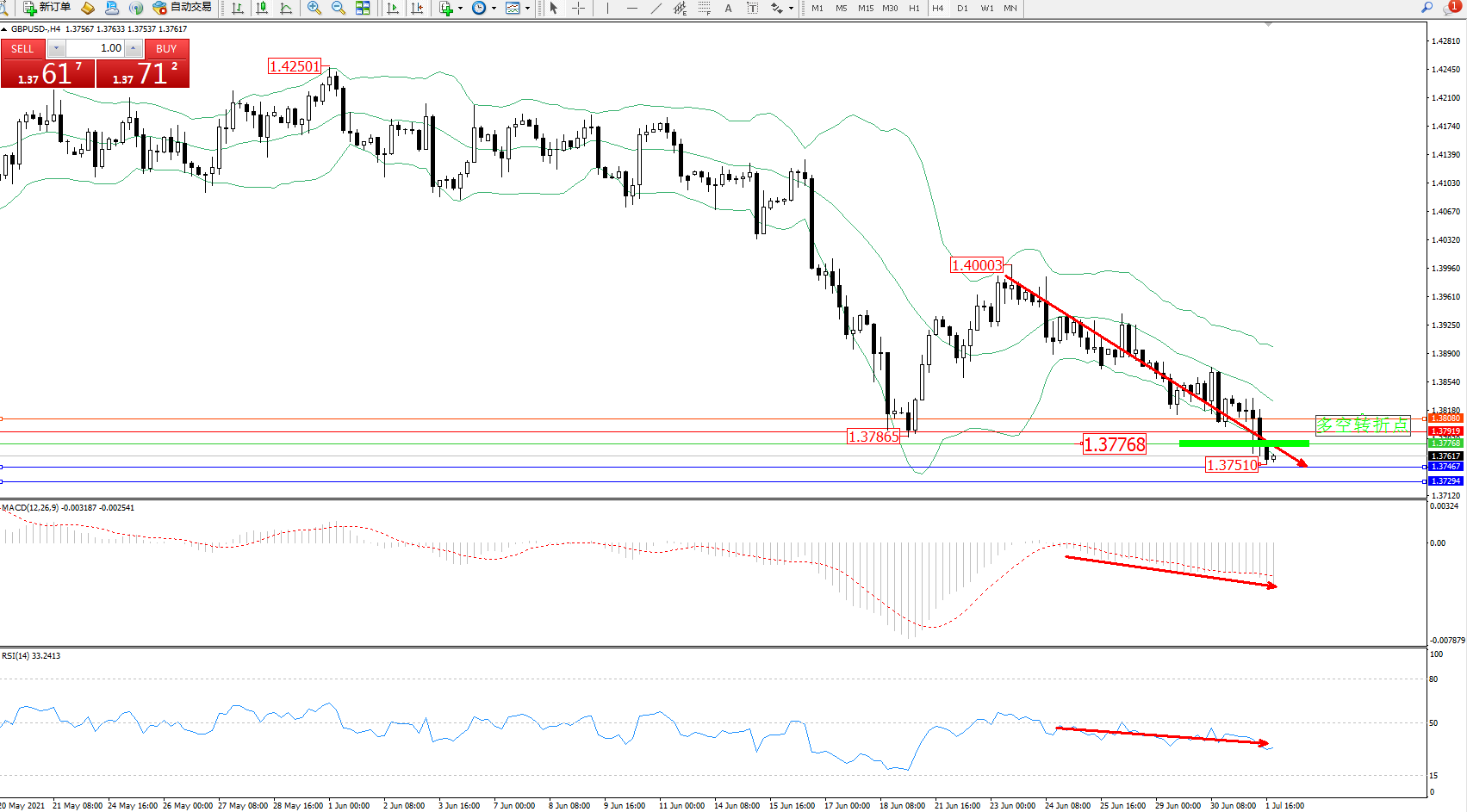 交易策略:1.37768下方看跌,目标1.37467、1.37294