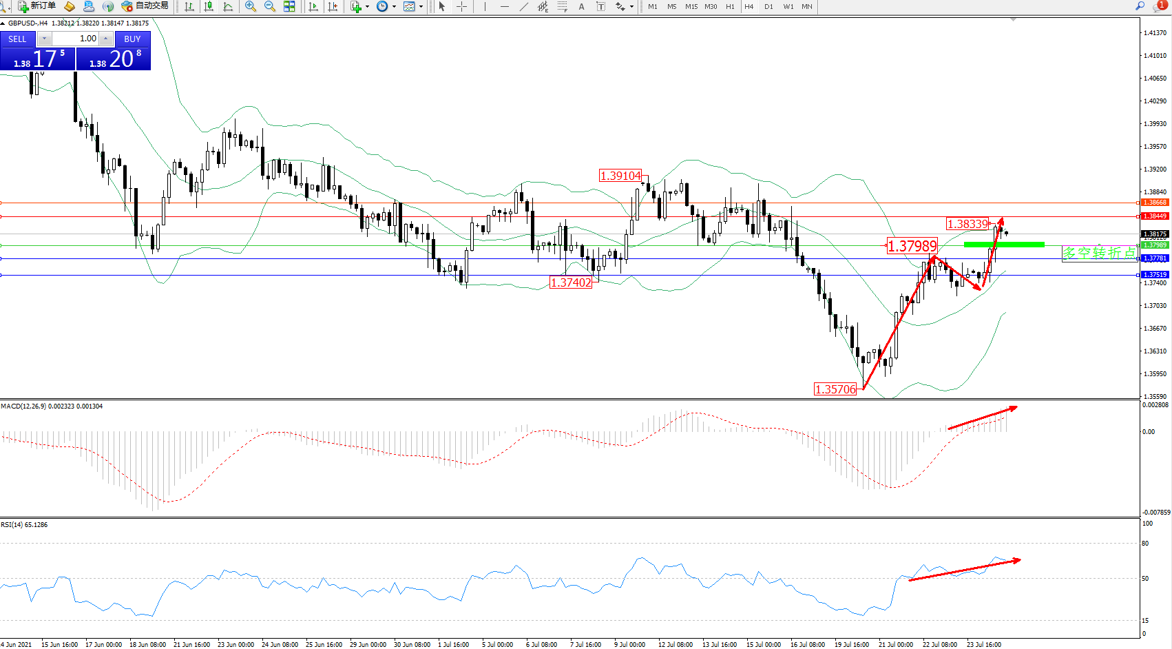 交易策略:1.37989上方看涨,目标1.38449、1.38668