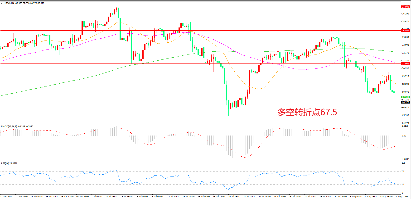 交易策略:在67.50之下看跌,目标64.00 60.00