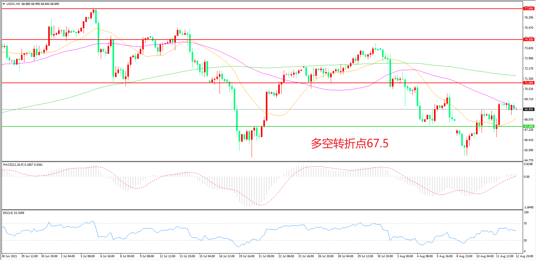 交易策略:在67.50之上看涨,目标71.00 74.50