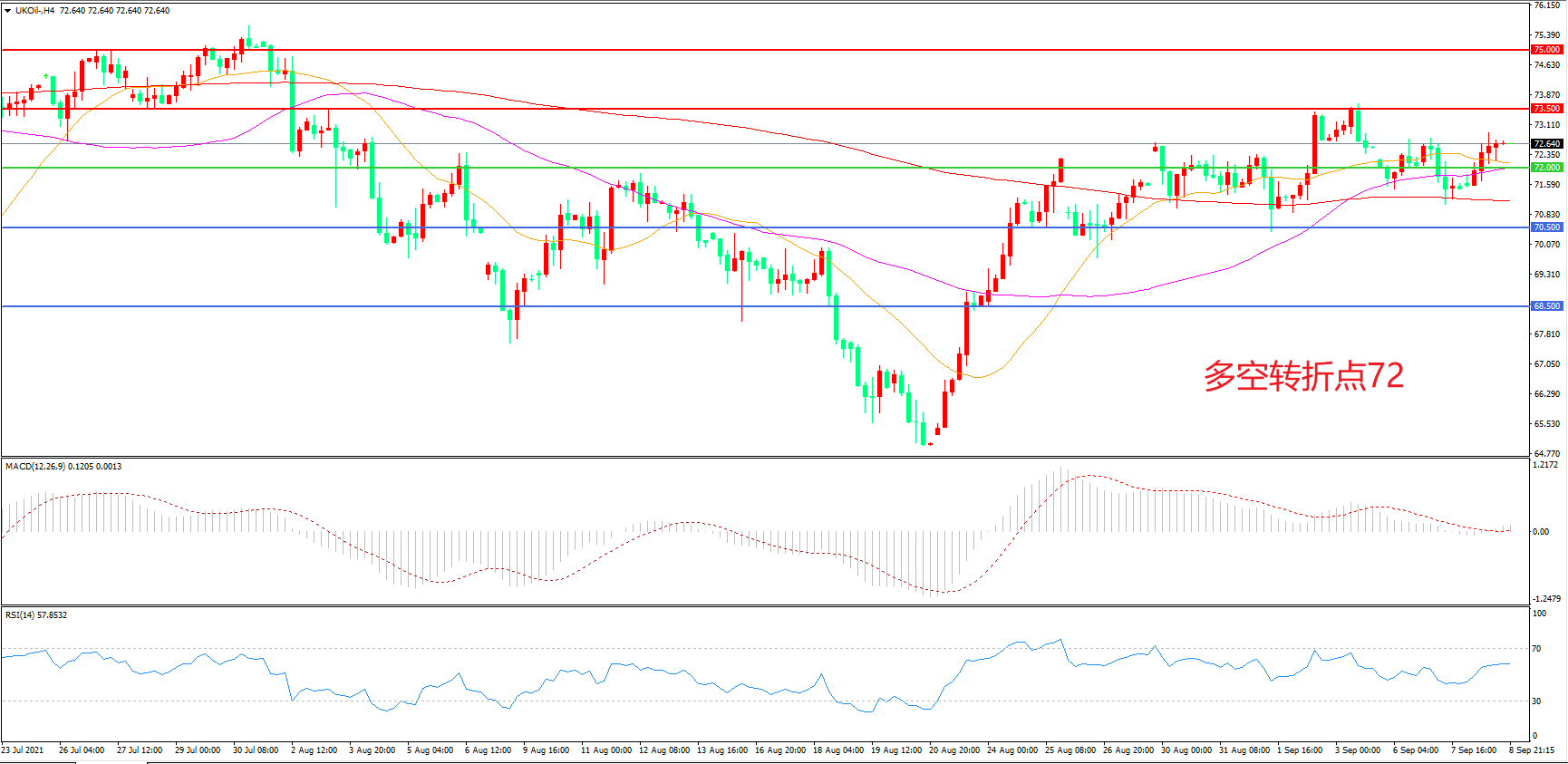 4小时图看,油价围绕着55周期均线窄幅震荡,72美元成为多空分水岭,MACD红柱缩短,RSI指标走平,日内震荡上行概率较大。