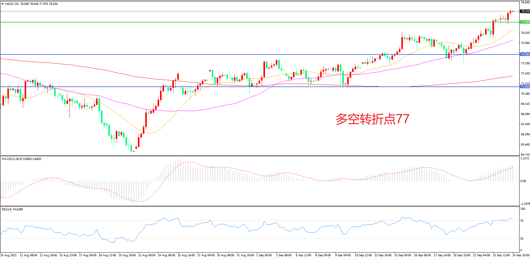4小时图看,油价长阳拉升,短期走势偏强,均线系统粘合形成下方支撑,MACD红柱增加,RSI指标走平,日内震荡上行概率较大。