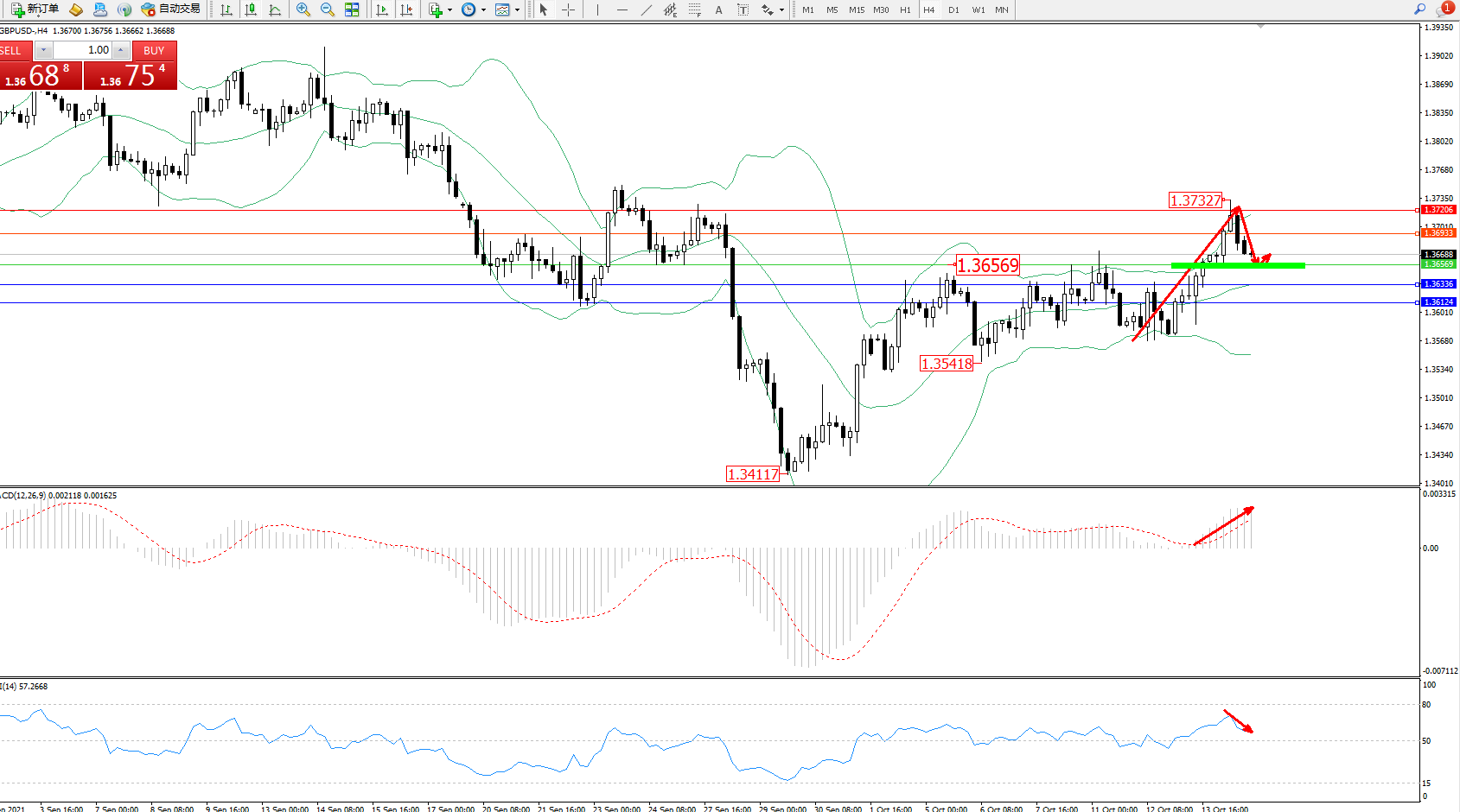 交易策略:1.36569上方看涨,目标1.36933、1.37206