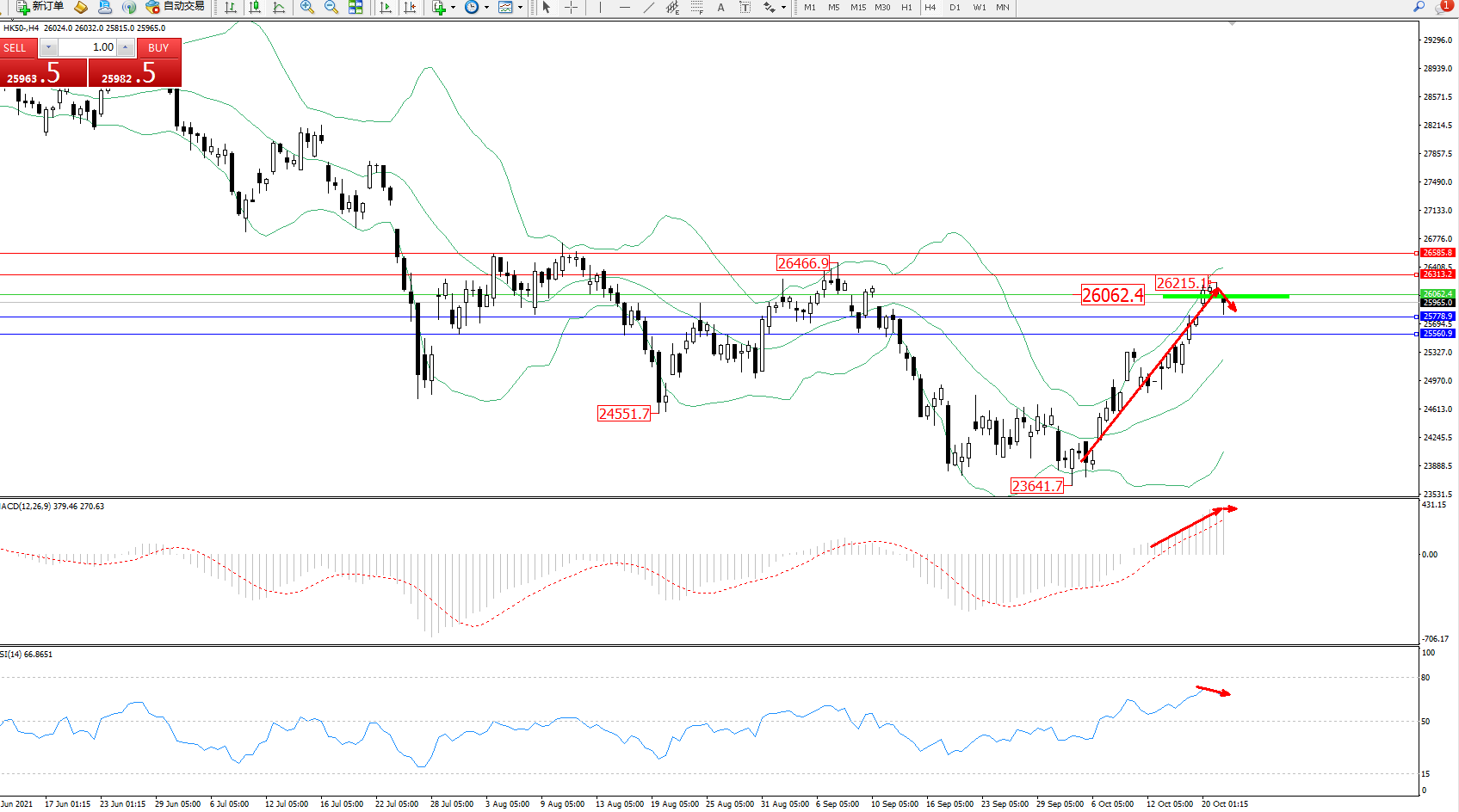 技术点评:多头动力延续布林带指标通道中上轨区间持续震荡上扬,高位抵达26215位置节点后开始短暂回撤,多头拉升上扬动力有继续向上移动态势,布林带指标呈收口走势持续拉升中,MACD指标处于多头区域维持整理向上移动,RSI指标处于多头区域维持震荡整理;