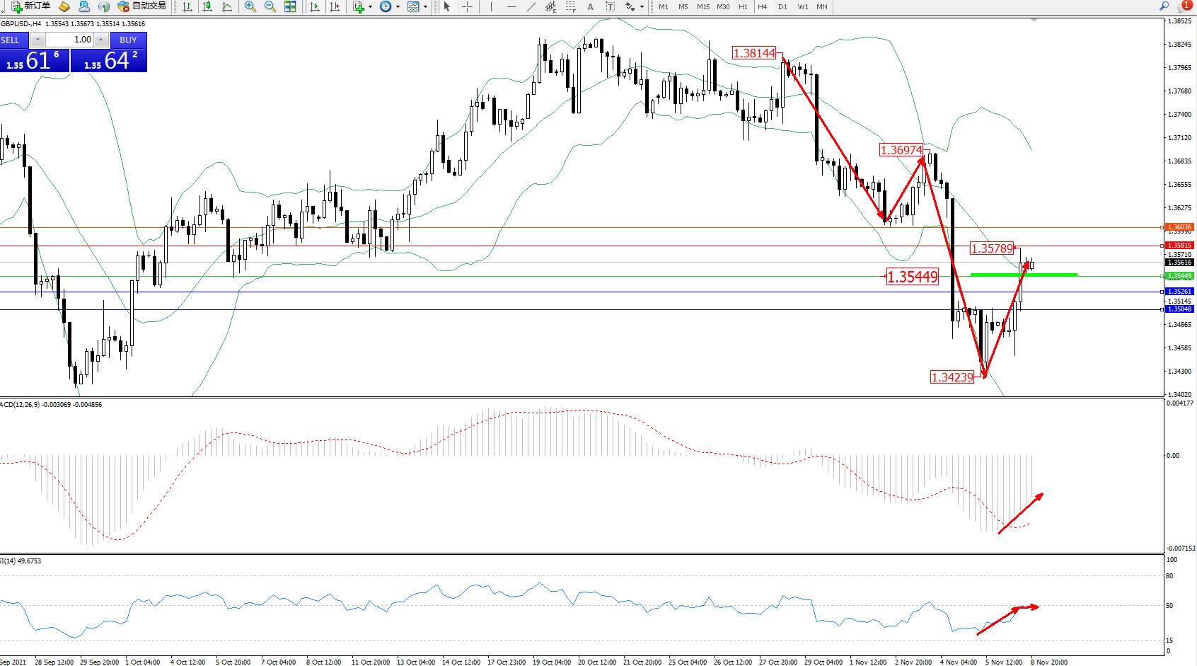 交易策略:1.35449上方看涨,目标1.35815、1.36036