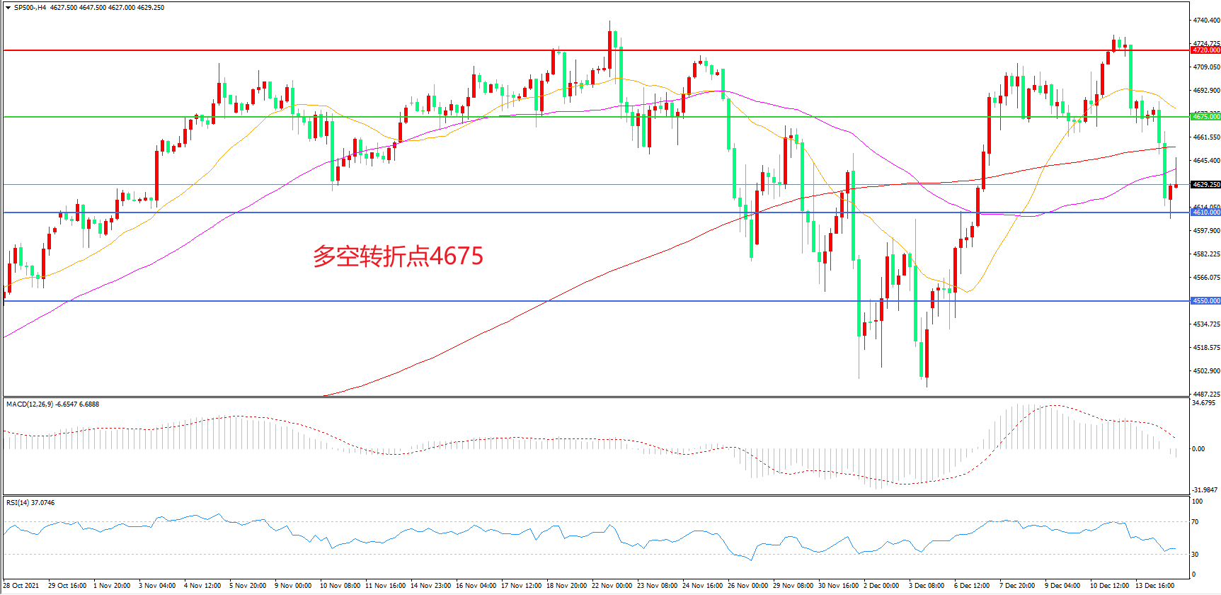 4小时图看,标普500回踩4610后小幅反弹,短期走势出现调整,均线系统走平,4675成为多空分水岭,MACD红柱缩短,日内延续震荡概率较大。