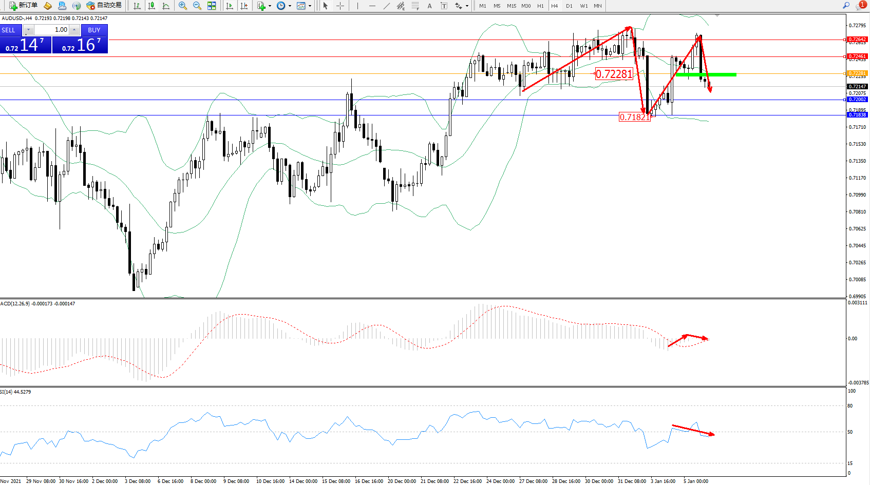 备选策略:0.72281上方看涨,目标0.72461、0.72642