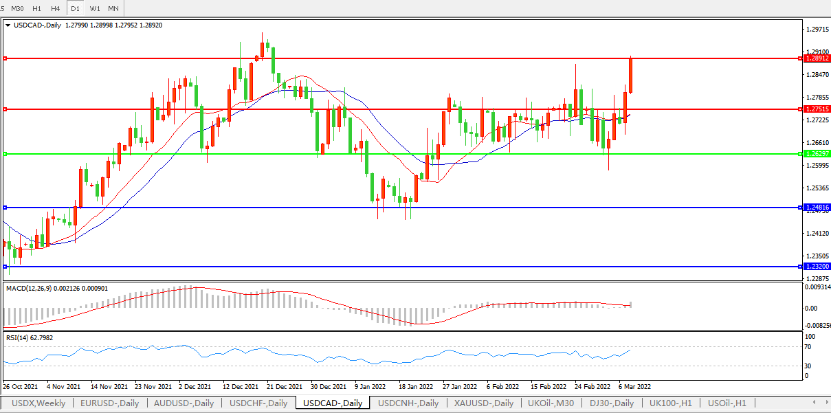 美英禁止饿能源进口,美元兑加元继续冲高