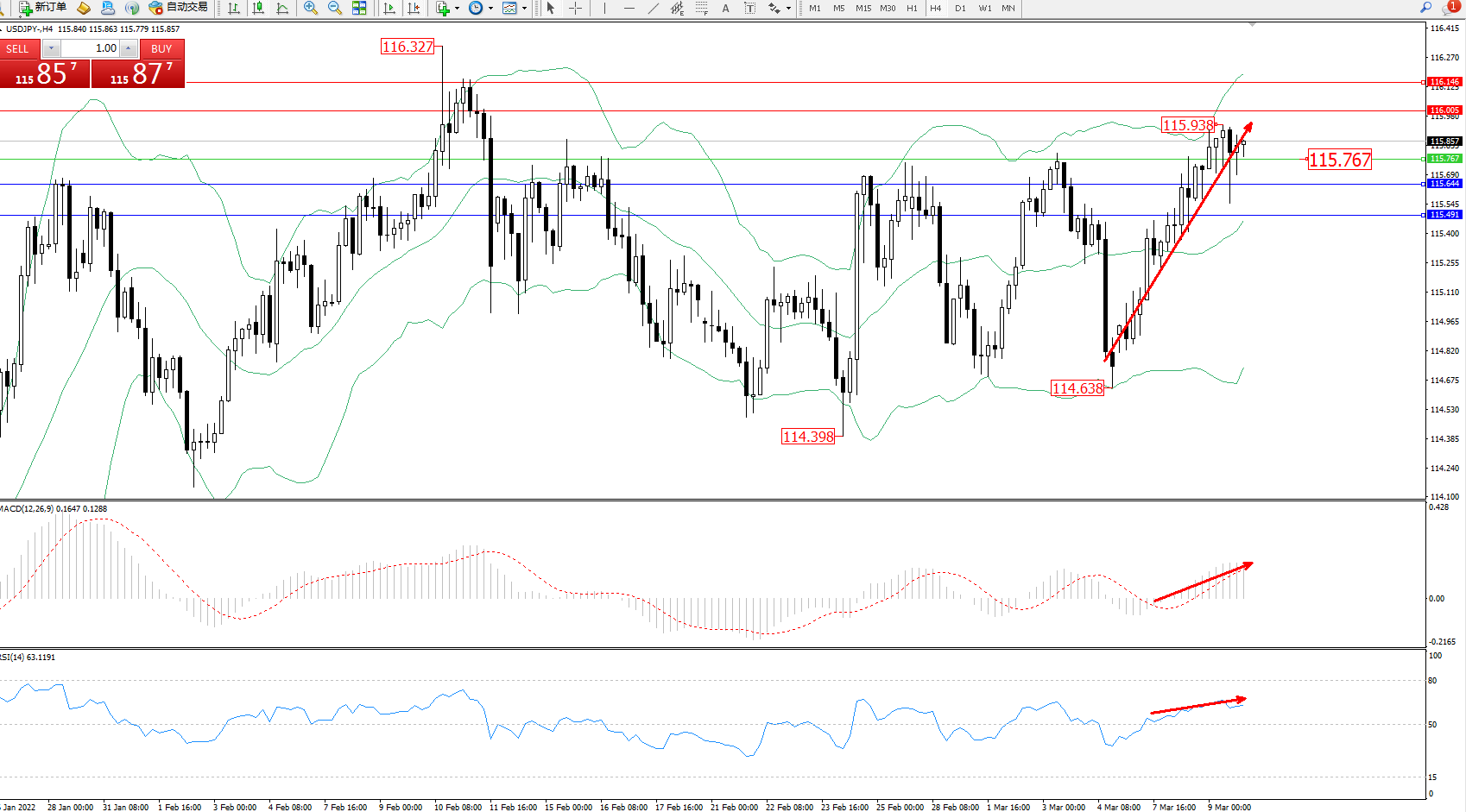技术点评:多头动力低位强势震荡上扬,触及布林带指标上方115.938位置节点后遇阻震荡,短期多头动力有进一步上移迹象,布林带指标呈张口走势良好,MACD指标处于多头区域维持整理缓慢上移,RSI指标处于多头区域维持震荡上扬后开始徘徊;