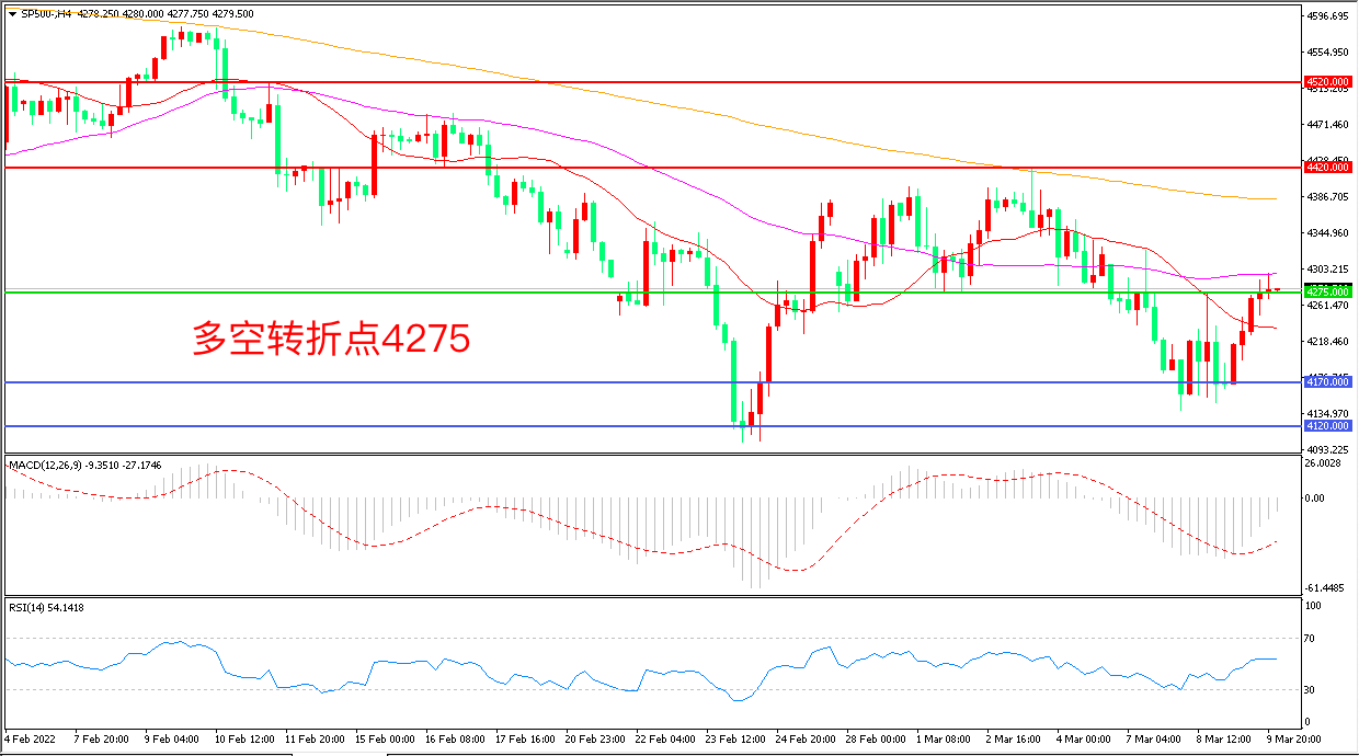 周三(3月9日),乌克兰执政党发表声明称不可能在未来几年加入北约,这是乌克兰当局首次就“基辅如何看待俄要求的国家中立地位”做出表述,俄乌局势缓解给市场多头带来信心,标普500大幅反弹,收报4279.50点。部分投资者惹味市场价格已充分体现西方制裁升级对全球经济的影响,而连续大跌后的抄底情绪也成为推手,短期看,股市抛售浪潮已得到缓解。