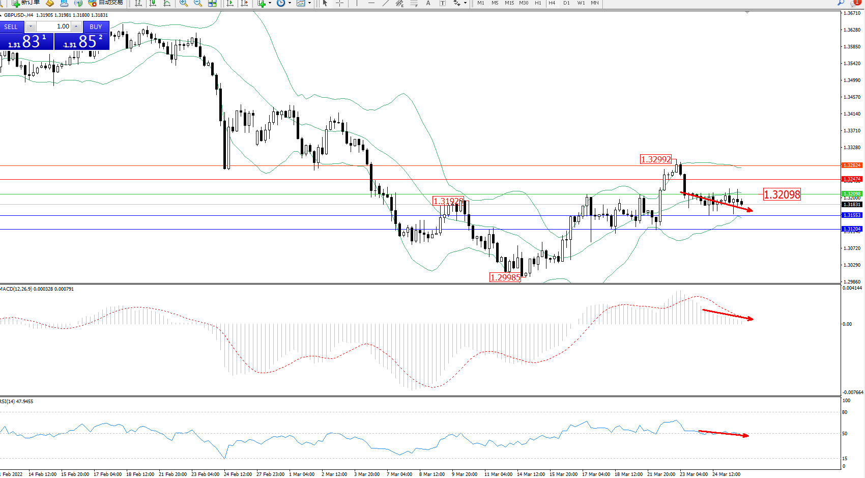 交易策略:1.32098下方看跌,目标1.31553、1.31204